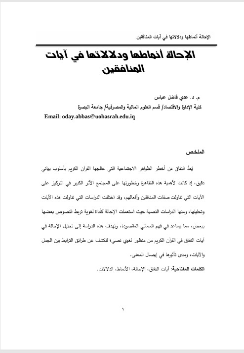 Hypocrisy considered as one of the most dangerous social phenomena that the Holy Qur’an addressed with a precise rhetorical style. Due to the importance of this phenomenon and its danger to society, there was great emphasis on the verses that discussed the traits and actions of the hypocrites. Studies analyzed these verses and they varied, including textual studies that used reference (al-iḥālah) as a linguistic tool that connects texts to one another, which helps in understanding the intended meanings. This study aims to analyze reference in the verses of hypocrisy in the Holy Qur’an from a textual linguistic perspective, in order to uncover the methods of connection between sentences and verses, and the extent of their effect in conveying the meaning.