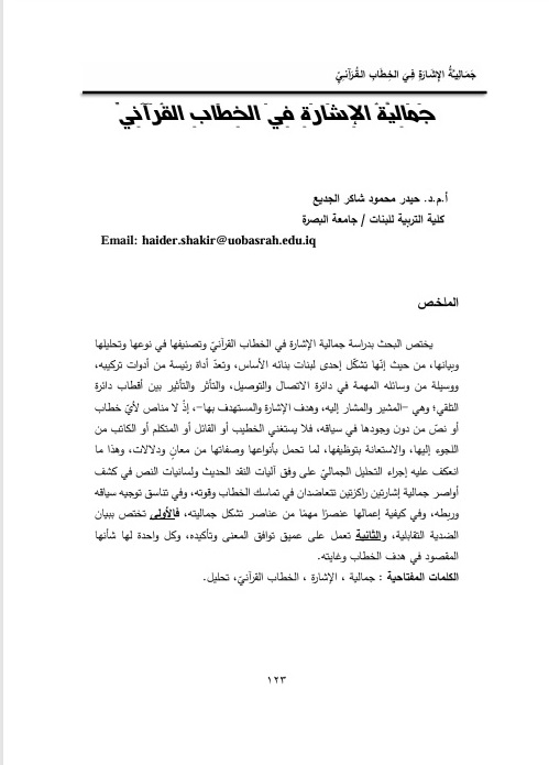 The research is concerned with studying the aesthetics of allusion in the Qur’anic discourse, classifying it according to its type, analyzing it, and explaining it, in that it constitutes one of the basic building blocks of its structure, and is considered a main tool of its composition, and a means of its important means in the circle of communication and delivery, and influence and impact between the poles of the circle of reception; They are - the signifier and the signified, the target of the sign and the target of it - since there is no escape for any speech or text without their presence in its context, so the orator, speaker, speaker or writer cannot do without resorting to them, and seeking assistance in employing them, because they carry with their types and qualities of meanings and connotations. This is what the aesthetic analysis of the mechanisms of modern criticism and text linguistics has focused on in revealing the aesthetic bonds of two central signs that support each other in the coherence and strength of the speech, and in the harmony of directing and linking its context and in the manner of introducing an important element of the elements that form its aesthetics. The first is concerned with clarifying the contrastive opposition, and the second works on the depth of the agreement of meaning and its confirmation, and each one has its intended role in the aim and purpose of the speech.                            .