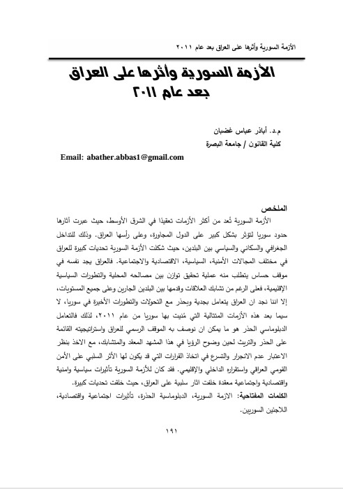 Basil Mohsen Mehanna, Muntadhar Abdulmunim Hassnawi, "The Syrian Crisis and Its Impact on Iraq's Security," Journal of the University of Kufa, College of Political Science, Najaf, Issue 69, 2023.