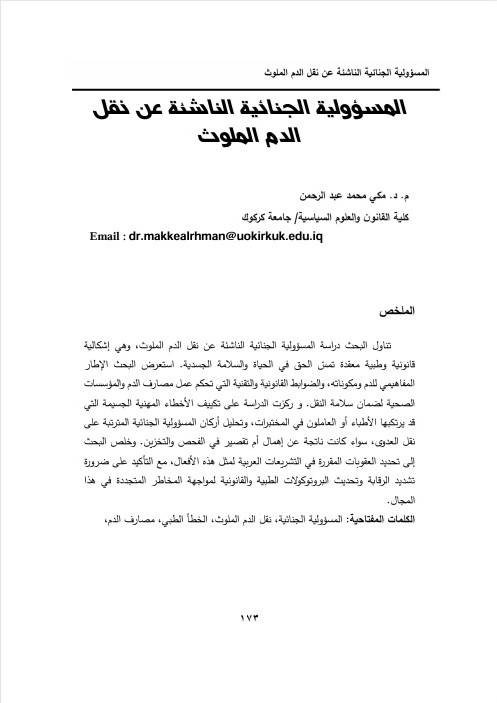 This study examines the criminal liability arising from contaminated blood transfusion, which represents a complex legal and medical issue affecting the right to life and bodily integrity. The study reviews the conceptual framework of blood and its components, as well as the legal and technical regulations governing blood banks and healthcare institutions to ensure the safety of transfusions. It also focuses on the legal classification of serious professional errors that may be committed by physicians or laboratory personnel and analyzes the elements of criminal liability resulting from the transmission of infection, whether caused by negligence or failure in testing and storage procedures. The study concludes by identifying the penalties prescribed in Arab legislation for such acts and emphasizes the need to strengthen oversight and update medical and legal protocols to address emerging risks in this field.