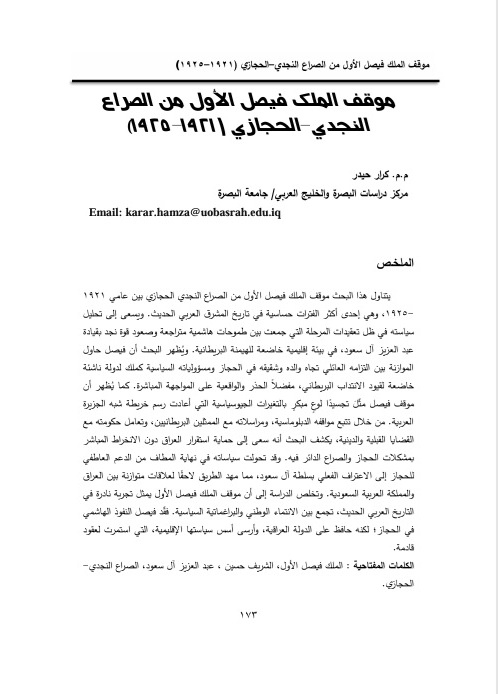 has This research examines King Faisal I's attitudes about the Najdi-Hijazi conflict for the period 1921 and 1925, one of the most sensitive periods in the history of the modern Arab East. It seeks to analyze his policy in light of the complexities of a period that combined waning Hashemite ambitions with the rise of Najdi power under the leadership of Abdulaziz Al Saud, within a regional environment subject to British hegemony. The research demonstrates that king Faisal attempted to balance his familial commitment to his father and brother in Al- Hijaz with his political responsibilities as king of an emerging state subject to the constraints of the British Mandate, preferring caution and realism to direct confrontation. It also demonstrates that Faisal's stance embodied an early awareness of the geopolitical changes that were redrawing the map of the Arabian Peninsula. By tracing his diplomatic stances, his correspondence with British representatives, and his government's handling of tribal and religious issues, the research reveals that he sought to protect the stability of Iraq without becoming directly involved in the problems and conflicts of the Hijaz. His policies eventually shifted from emotional support for the Hejaz to de facto recognition of the Al Saud authority, which later paved the way for balanced relations between Iraq and Saudi Arabia. The study concludes that King Faisal I's stance represents a rare experiment in modern Arab history, combining national affiliation with political pragmatism. Faisal lost Hashemite influence in the Hejaz, but he preserved the Iraqi state and laid the foundations for its regional policy, which would endure for decades to come.