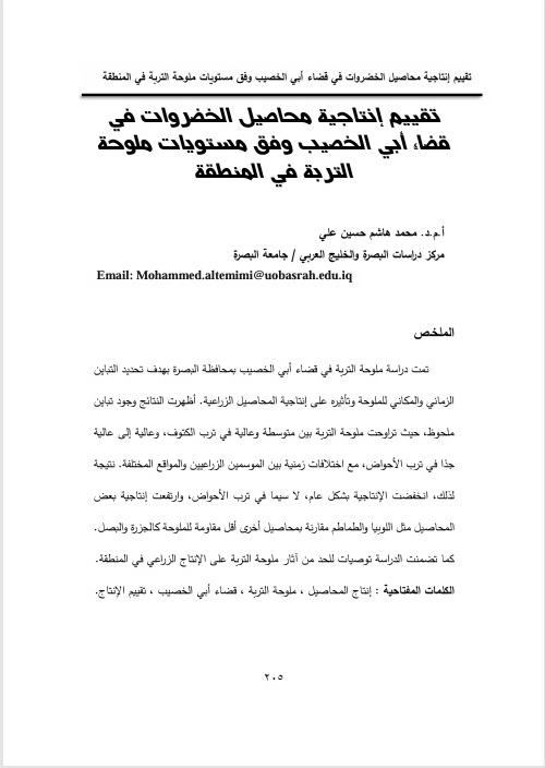 Soil salinity was investigated in Abu Al-Khasib District, at Basra Governorate, with the aim of identifying the spatial and temporal variability of salinity and its impact on agricultural crop productivity. The results revealed considerable variation in soil salinity levels, ranging from moderate to high in levee soils, and from high to very high in basin soils, with temporal differences observed between the two agricultural seasons and among different locations. Consequently, overall crop productivity declined, particularly in basin soils. However, the productivity of certain crops, such as cowpea and tomato, was relatively higher compared to less salt-tolerant crops like carrot and onion. The study also proposed recommendations to mitigate the adverse effects of soil salinity on agricultural production in the region.