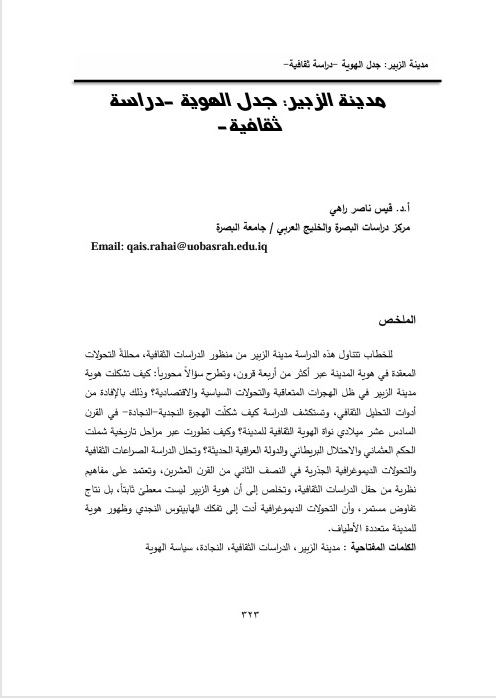 Nasir Rahai, P. D. Q. (2026). Al-Zubair City: The argument of Identity - A Cultural Study. Basra Studies Journal, 1(ملحق العدد 65), 323–346. Retrieved from https://bsj.uobasrah.edu.iq/index.php/bsj/article/view/445