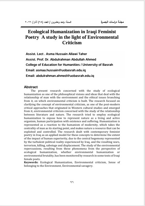 Ecological Humanization in Iraqi Feminist Poetry A study in the light of Environmental Criticism