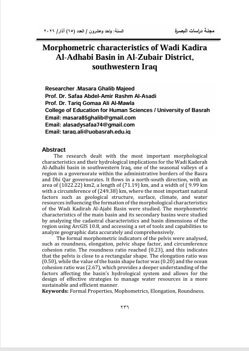 Morphometric characteristics of Wadi Kadira Al-Adhabi Basin in Al-Zubair District, southwestern Iraq