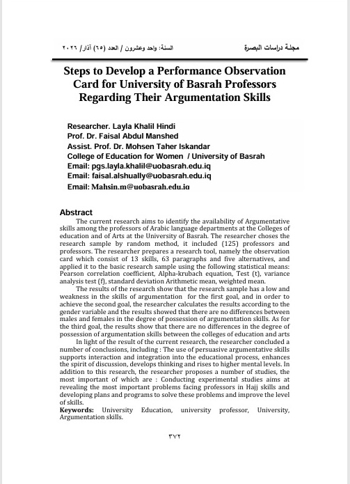 Steps to Develop a Performance Observation Card for University of Basrah Professors Regarding Their Argumentation Skills